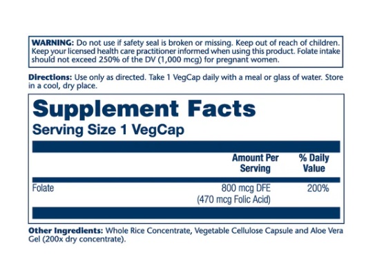 Folate (470 mcg Folic Acid), Whole Rice Concentrate, Vegetable Cellulose Capsule and Aloe Vera Gel (200x dry concentrate).
